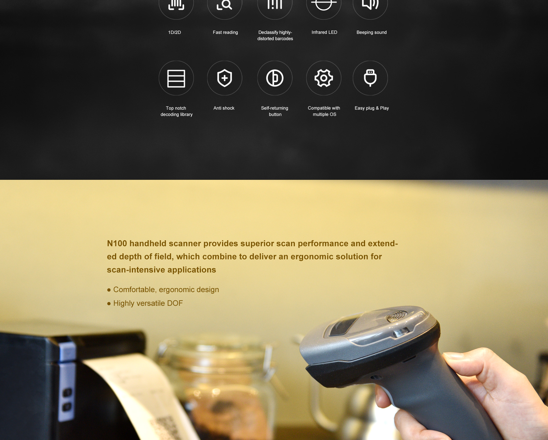 Test Condition | Environment temperature: 23ºC Environment illumination: 300LUX filament lamp DOF depends on the resolution, contrast of the printing codebar, and the environment illumination |