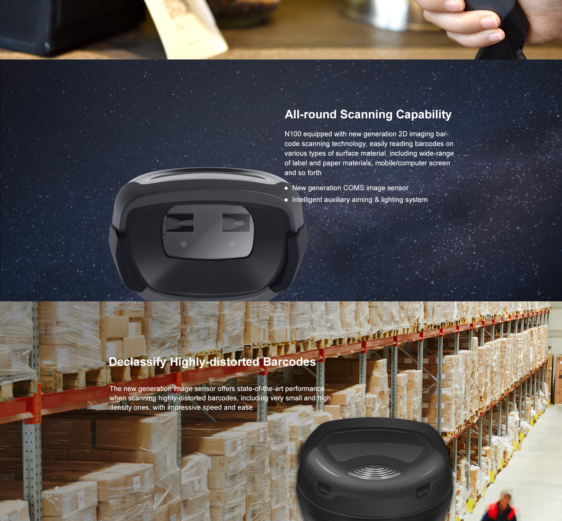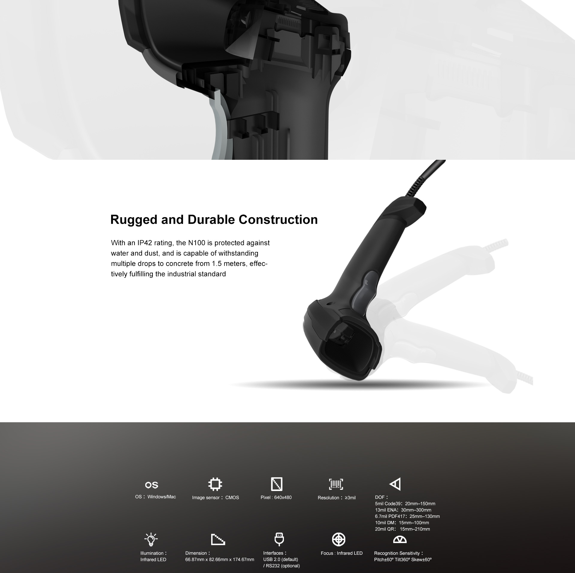 Typical DOF | 5mil Code39: 20mm–150mm ENA: 30mm–300mm 6.7mil PDF417: 25mm–130mm 10mil DM: 15mm–100mm 20mil QR: 15mm–210mm | |