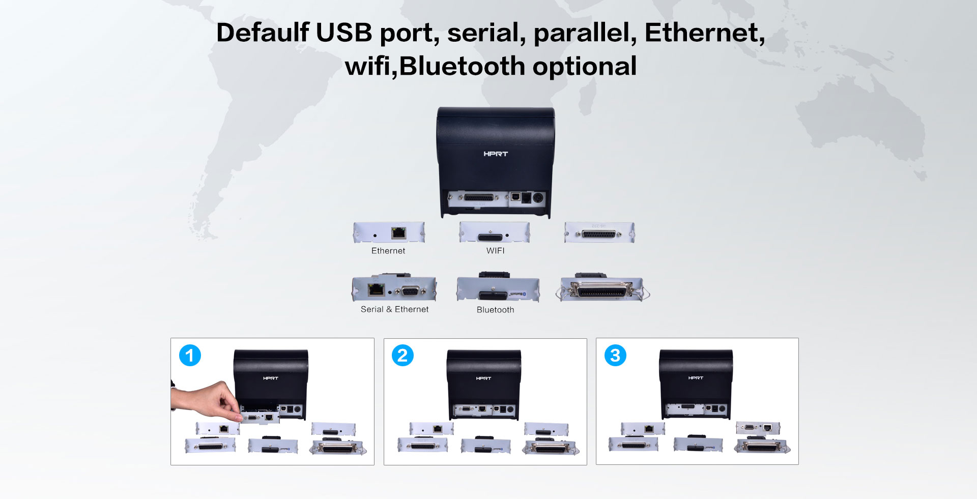 Options Accessories | USB/Serial/Parallel Cable, Paper roll, Power Adapter, Power Cord, CD, Quick Start Guide | ||